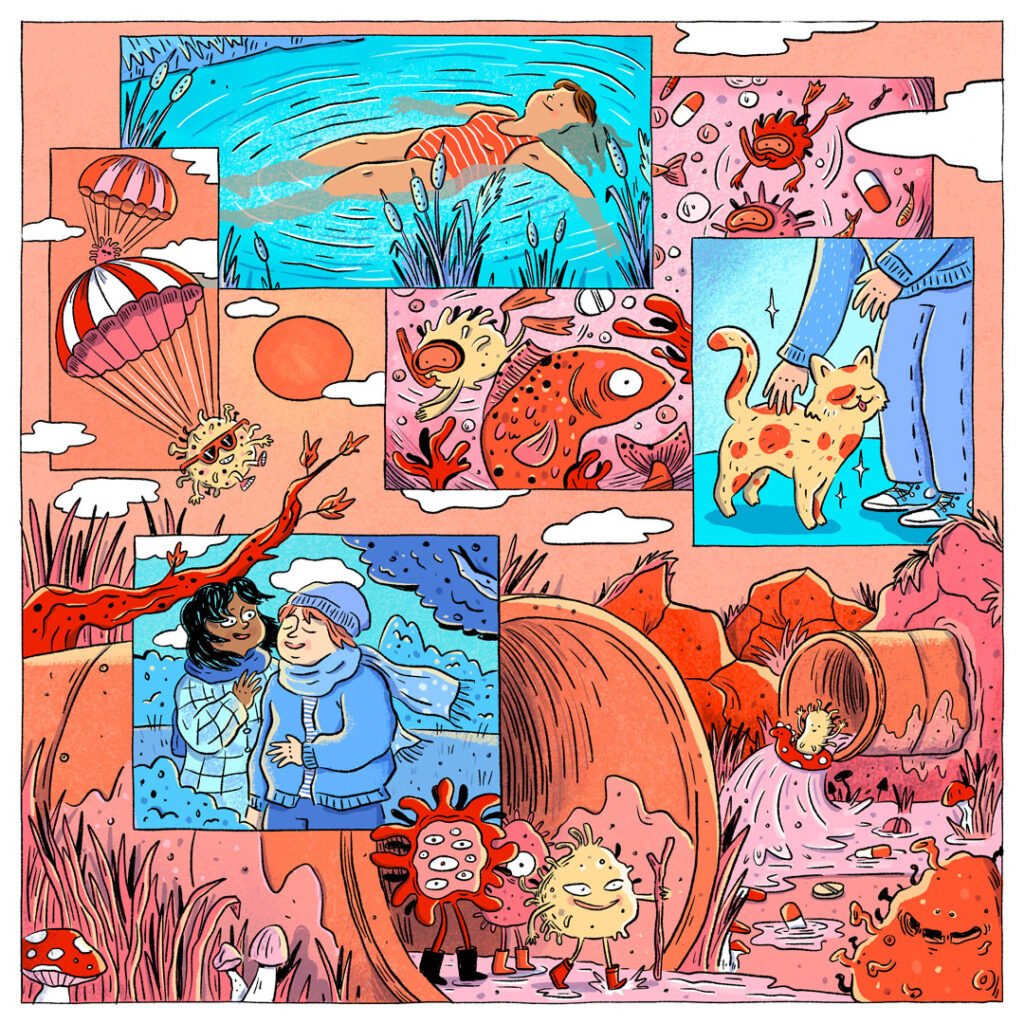 « La résistance aux antimicrobiens ne connaît pas de frontières. En tant qu’êtres humains, nous n’en sommes pas toujours conscients. Mais si vous regardez attentivement les images et les couleurs, vous verrez des microbes se déplacer dans l’air, l’eau, les déchets, les animaux… »