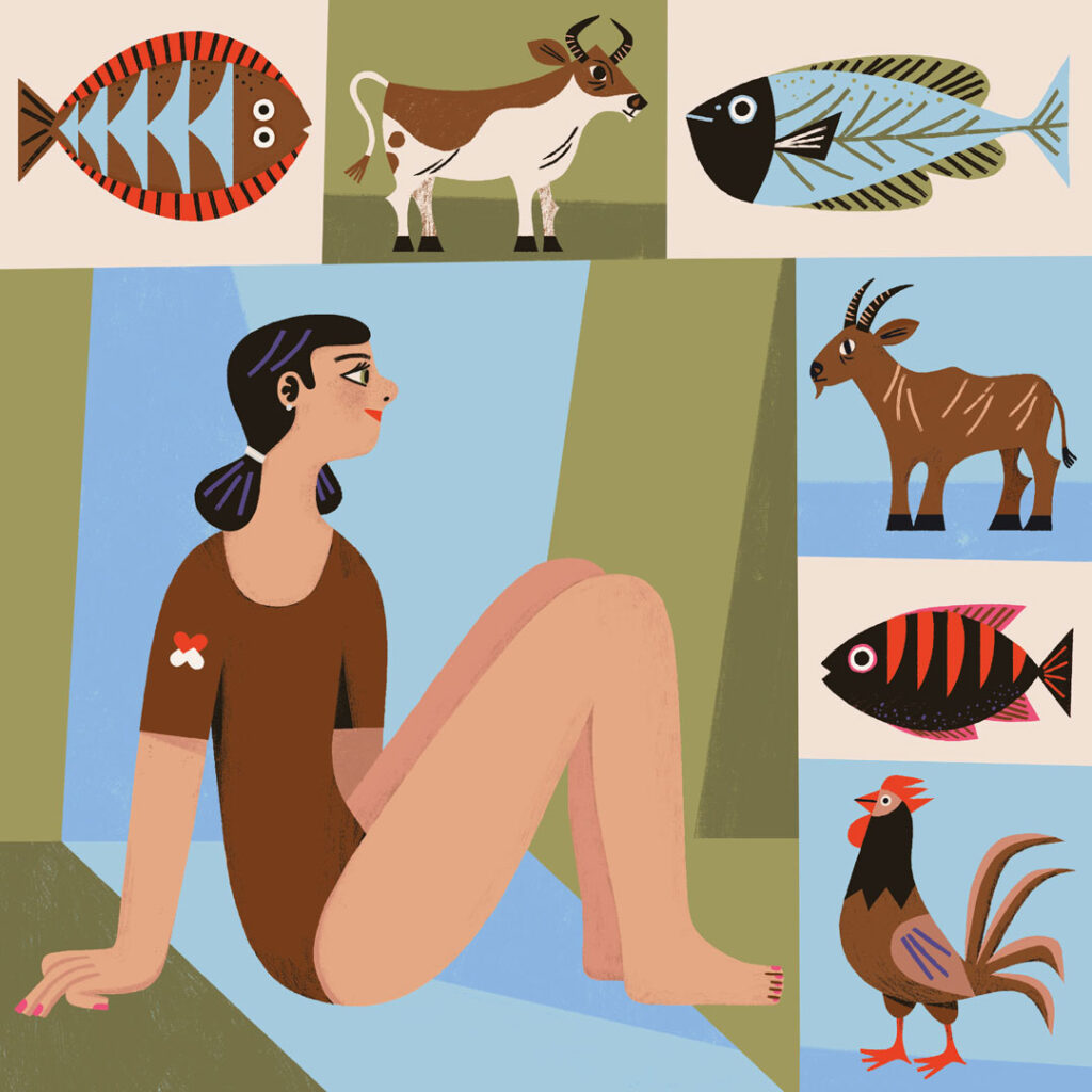 Cette illustration représente un être humain à égalité avec les animaux, croisant leur regard et conscient que son existence est inextricablement liée à la leur. »