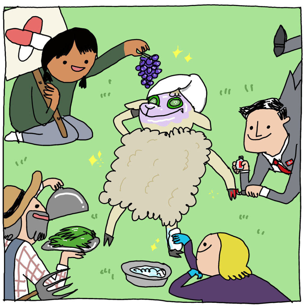 « J’ai dessiné un mouton vivant sa meilleure vie — comme tous les animaux devraient pouvoir le faire. Un politicien, un manifestant, un agriculteur et une “personne ordinaire” symbolisent le fait que chacun peut contribuer. Par de bonnes habitudes de consommation, des actions politiques et des pratiques agricoles responsables, nous pouvons œuvrer ensemble pour que les animaux d’élevage soient en bonne santé, heureux et n’aient pas besoin d’antibiotiques. C’est bon pour les animaux, et bon pour nous aussi, car cela garantit que les antibiotiques resteront efficaces lorsque nous en aurons besoin. »
