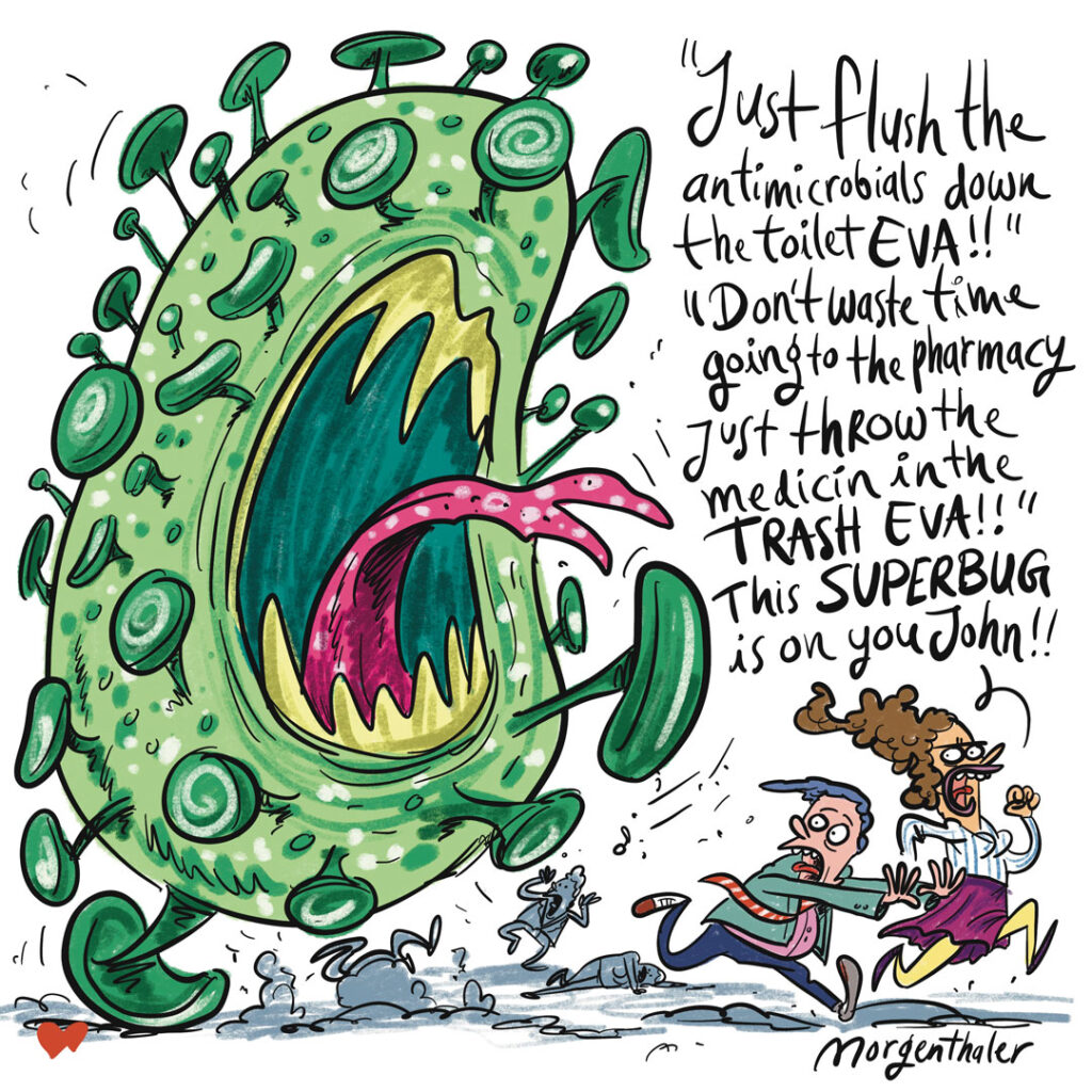 “‘Spoel de antimicrobiële middelen gewoon door het toilet, EVA!’ — ‘Verspil geen tijd met naar de apotheek gaan, gooi ze gewoon in de vuilnisbak, EVA!’ — ‘Die superbacterie is jouw schuld, John!’